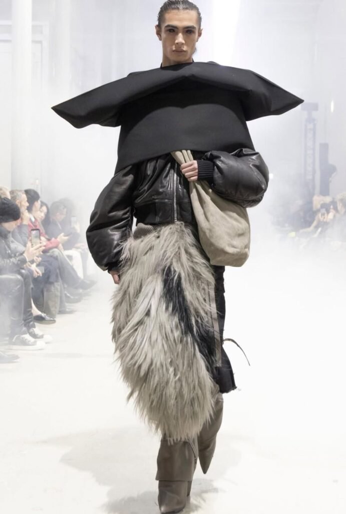 En el Palacio de Tokio, Rick Owens transforma la pasarela en un escenario distópico, donde la moda masculina se atreve a romper todos los límites: volúmenes extremos, materiales industriales y peinados que son arte en movimiento.