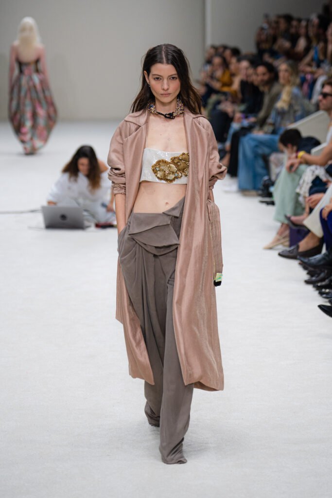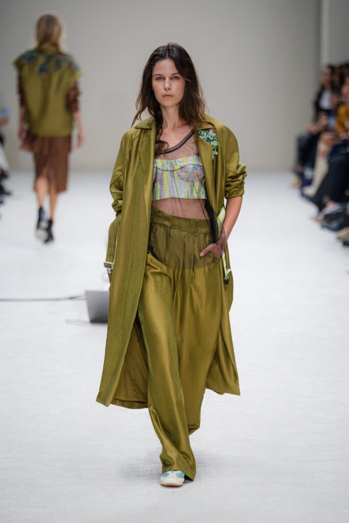 Incorpora bordados artesanales que contrastan con estampados diseñados digitalmente, capturando la esencia futurista de la colección. Detalles como hebillas metálicas añaden un toque de modernidad y funcionalidad, mientras que los bolsillos maxi y los acabados capitonados resaltan su carácter contemporáneo. La propuesta busca cuestionar cómo la innovación puede coexistir con nuestra necesidad de conexión, autenticidad y sostenibilidad.