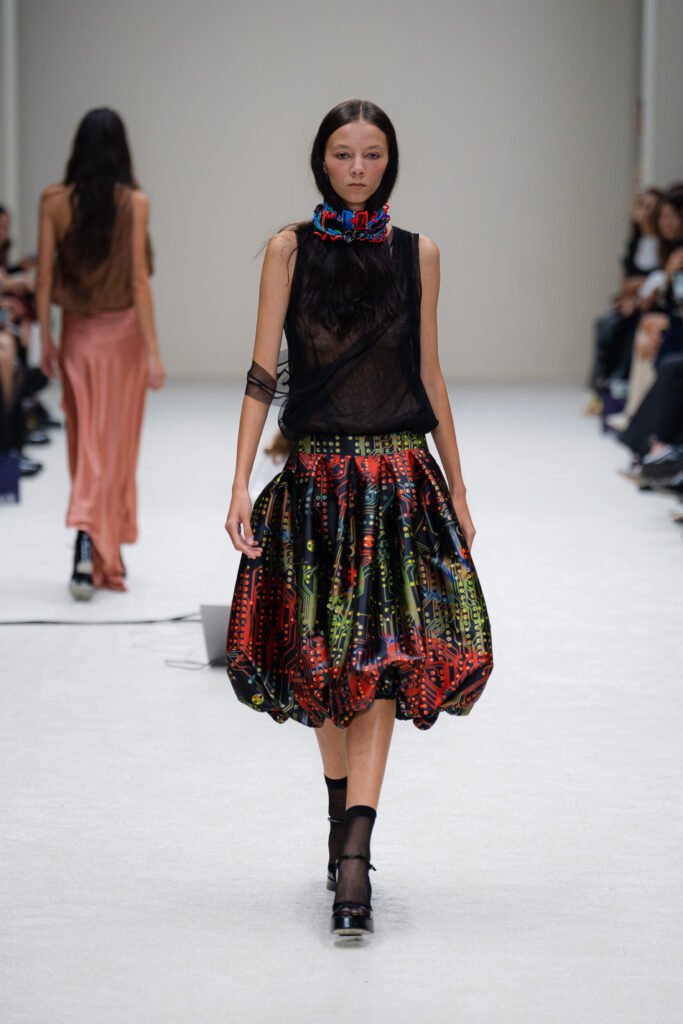 La colección «LoTEK» combina elementos futuristas con toques orgánicos, utilizando materiales sostenibles y técnicas artesanales tradicionales que se entrelazan con la tecnología, creando prendas que invitan a repensar el papel de la moda en el futuro.