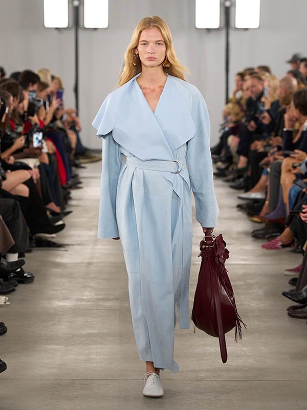 Uno de los momentos visualmente más fuertes fue un abrigo largo de ante azul bebé dividido en paneles arquitectónicos. Los solapas eran tan amplias que parecía poder desprenderse una segunda prenda.