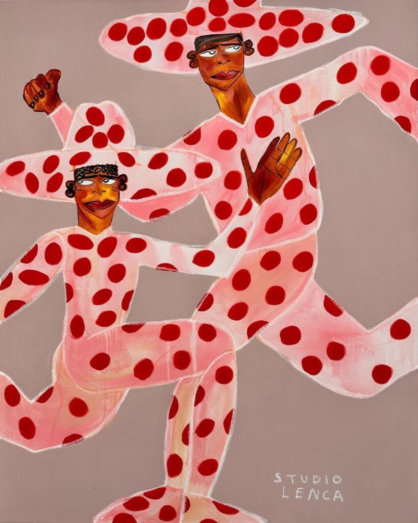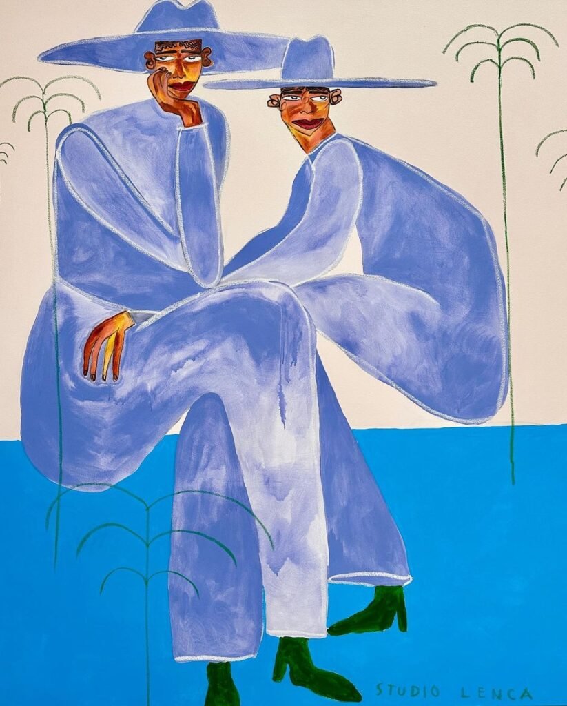 Junto a las figuras monumentales que miran con confianza desde el lienzo y están vestidas con colores llamativos, Studio Lenca crea un mundo donde las personas latinx tienen el poder de ocupar un espacio y contar sus propias historias.