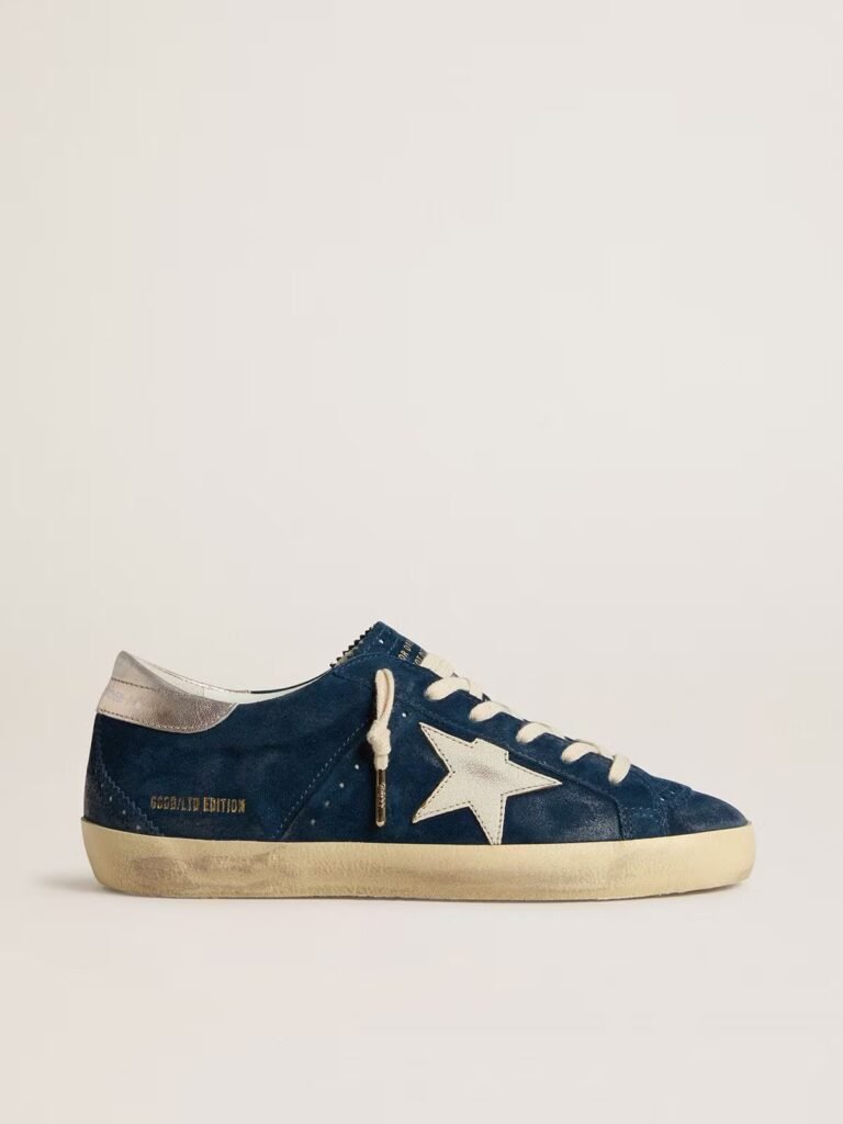 Golden Goose lo hace de nuevo con esta versión en gamuza azul navy y su estrella blanca desgastada. El acabado pre-loved típico de la marca les da ese encanto cool effortless.