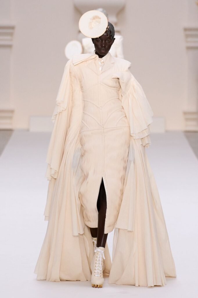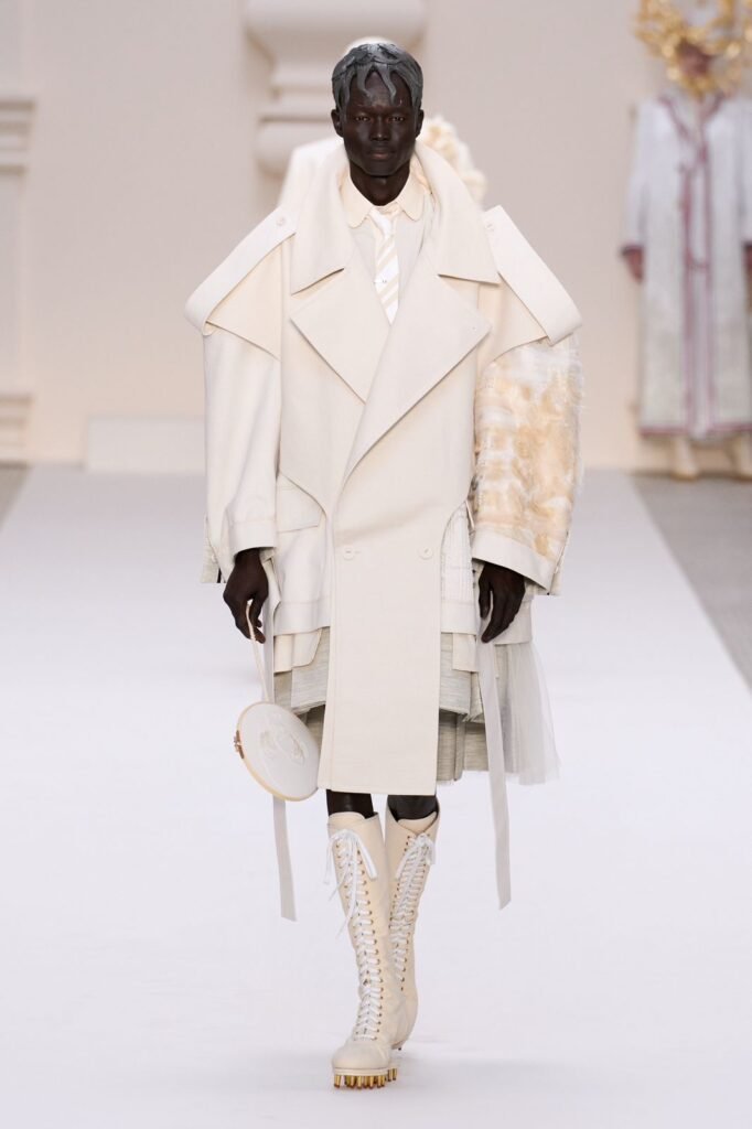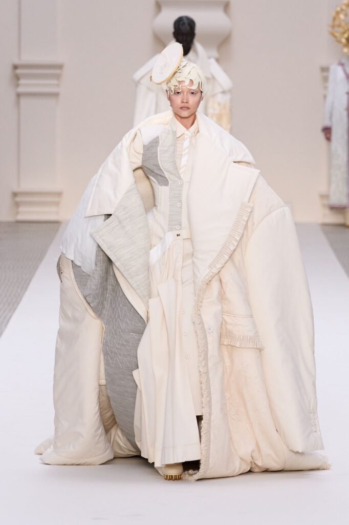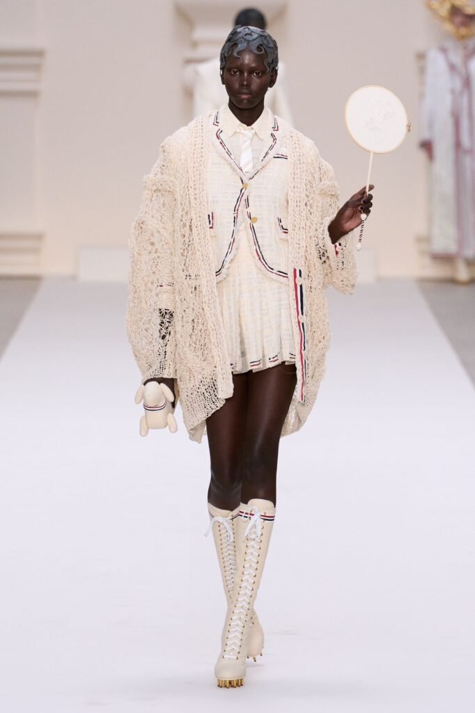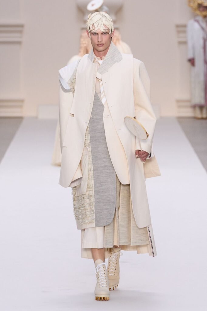 Como una dulce victoria. El color crema, fue el predilecto para pulir de manera artesanal cada atuendo. Casi tan dulce y ligero como la tonalidad de una flor de vainilla. Los desfiles de Thom Browne son conocidos por su carácter teatral y conceptual. Sus presentaciones suelen ir más allá de la simple exhibición de ropa, incorporando elementos de performance art que exploran temas narrativos complejos.