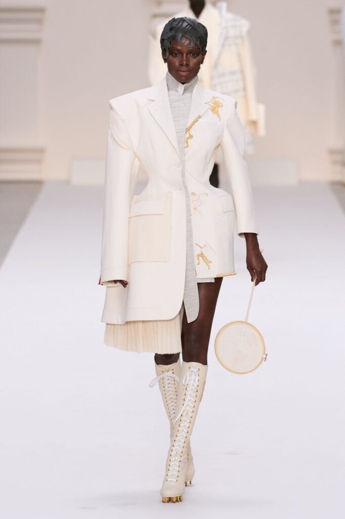 El accesorio statement de la firma por supuesto fue el bolso Hector, vagamente conocido como el bolso de perro salchicha en color crema, los bastidores bordados a mano como usados por los modelos como accesorio también han captado nuestra atención. Como una oda a los juegos olímpicos de París, la presencia de bolsos en forma de silbato, ornamentos de hojas como lo usaban los griegos, el uso del tejido en los sweater, la ligereza de las telas con pliegues hacen de este una pasarela pulcra, llena de significados.