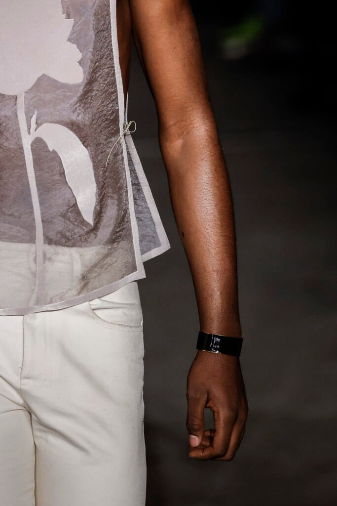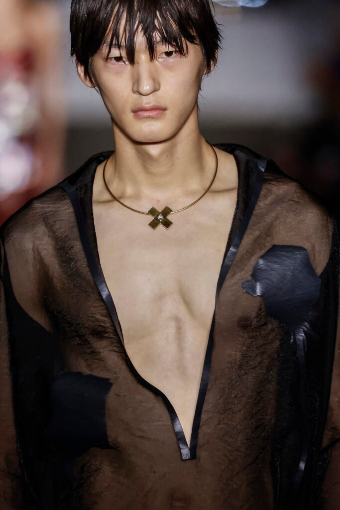 La piel de becerro negra sirve como material base de la colección y se puede ver en looks que recuerdan a las chaquetas de aviador extraídas de los autorretratos del artista, con una intrincada interpretación en relieve de Heart and Dagger (1982) de Mapplethorpe.