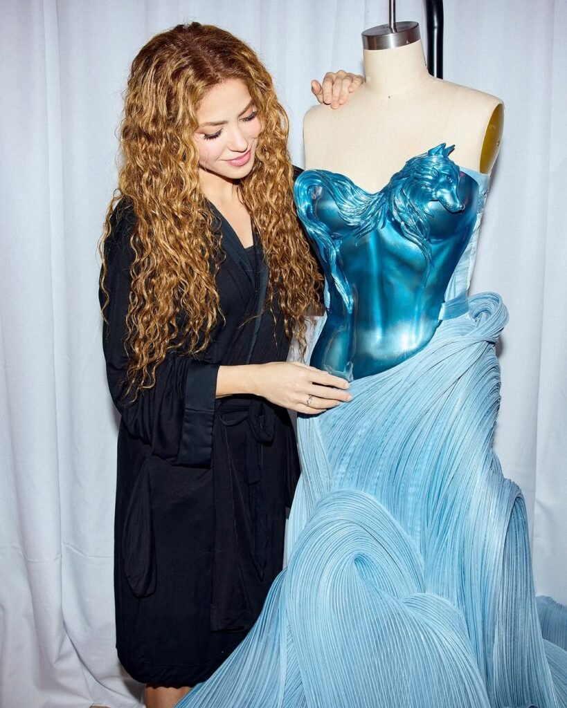 • Gaurav Gupta: El diseñador indio es responsable de un vestido azul platino que Shakira utiliza durante la interpretación de «Acróstico». Este diseño destaca por sus ondas plisadas en volumen 3D y un corsé metalizado con la figura de una loba en el escote.
