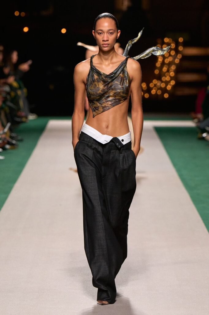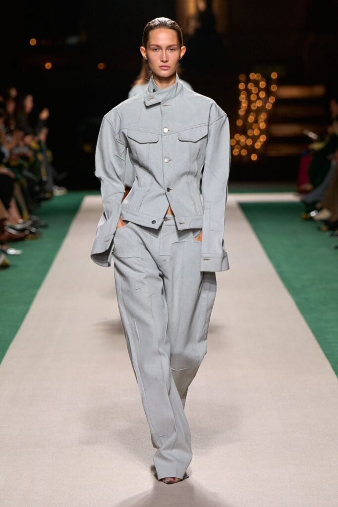 Los pliegues adornan los pantalones vaqueros de lana reciclada y las chaquetas con costuras en forma de corsé que evocan el lenguaje de la lencería.