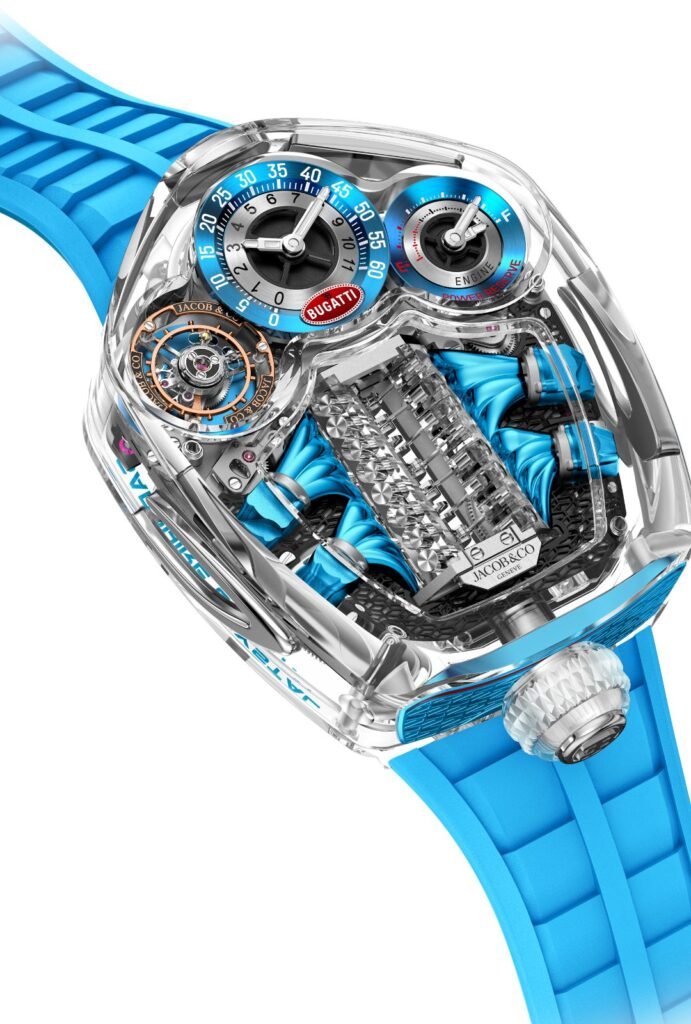La caja, tallada íntegramente en cristal de zafiro, ofrece una transparencia total de 360 grados que revela cada componente del movimiento, incluido su espectacular módulo inspirado en el motor V16 de Bugatti. Nada se oculta: todo se expone como parte del diseño.