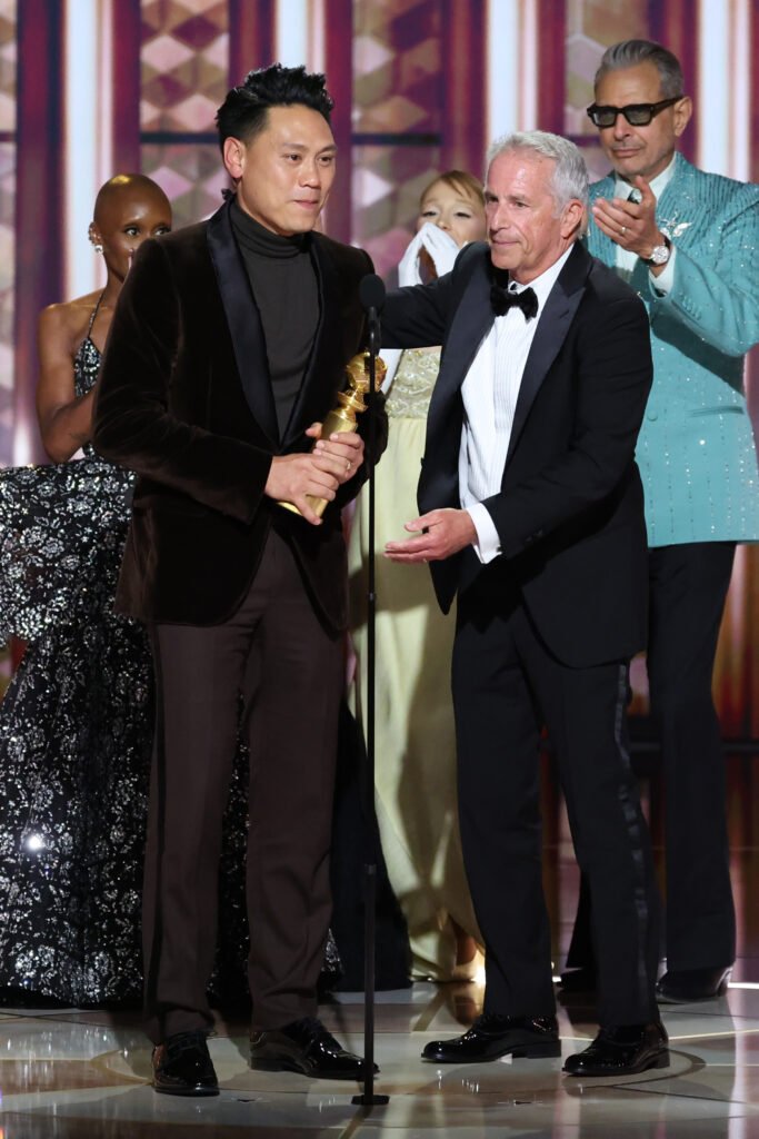 Jon M. Chu, Marc E. Platt, Jeff Goldblum wins Cinematic and Box Office Achievement for «Wicked» during the 82nd Annual Golden Globes held at The Beverly Hilton on January 05, 2025 in Beverly Hills, California. (Photo by Rich Polk/GG2025/Penske Media via Getty Images)
