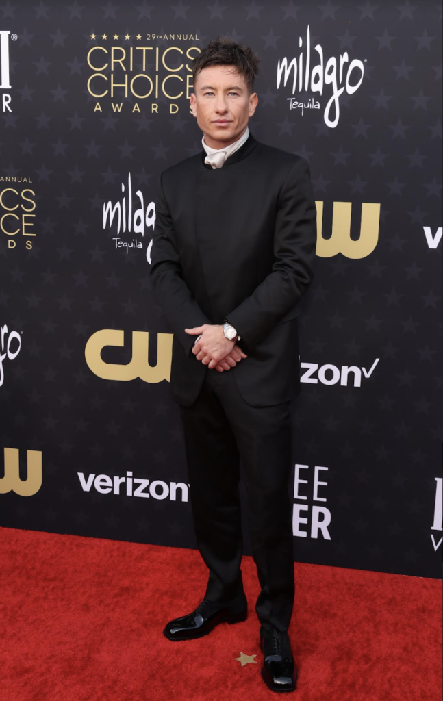 Barry Keoghan, protagonista de la película nominada «Saltburn», llevaba una chaqueta sin cuello de lana negra de ZEGNA con detalle de superposición descentrada, pantalones de lana negra, camisa sin cuello de mezcla de seda y cachemira blanca y foulard blanco de seda pura.