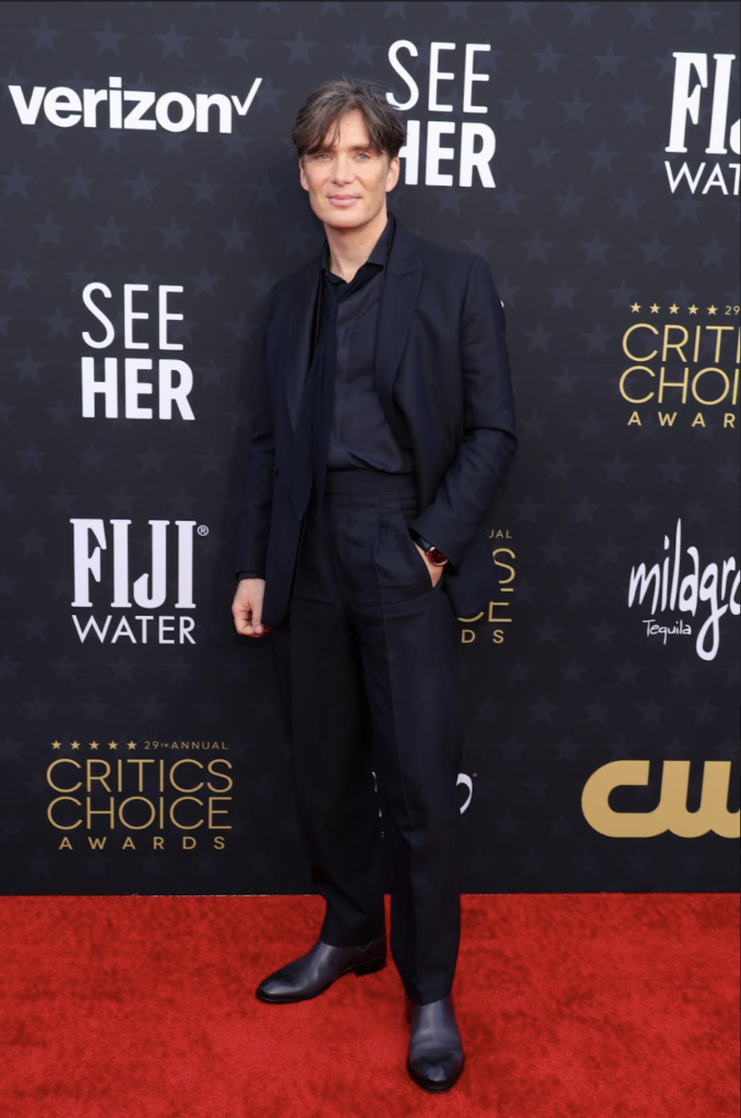 Cillian Murphy, protagonista de la premiada película «Oppenheimer» y nominado a Mejor Actor de Cine, lució un esmoquin de raya diplomática con solapa de muesca en mezcla de lana y seda con detalles de satén, pantalón plisado de cintura alta a juego, camisa de noche de pura seda, foulard de pura seda y botas de piel lisa, todo ello en azul marino tonal.