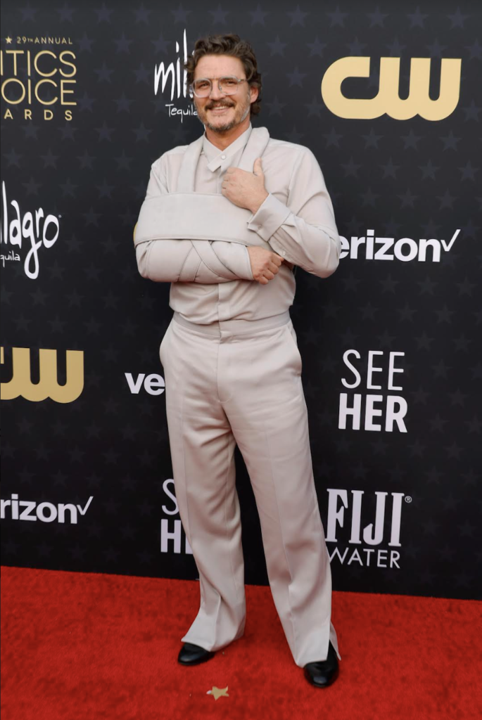 Pedro Pascal, nominado a Mejor Actor en una Serie Dramática, lució una camisa sin cuello icónica en mezcla de lana y seda hecha a medida de ZEGNA con detalle de banda superpuesta y tapeta cubierta, pantalones de pernera recta con dobladillo dividido y detalles laterales de satén, un fular de ante con detalles de piel, gafas de acetato transparente y metal, todo ello en gris perla monocromático, con mocasines negros de piel lisa.