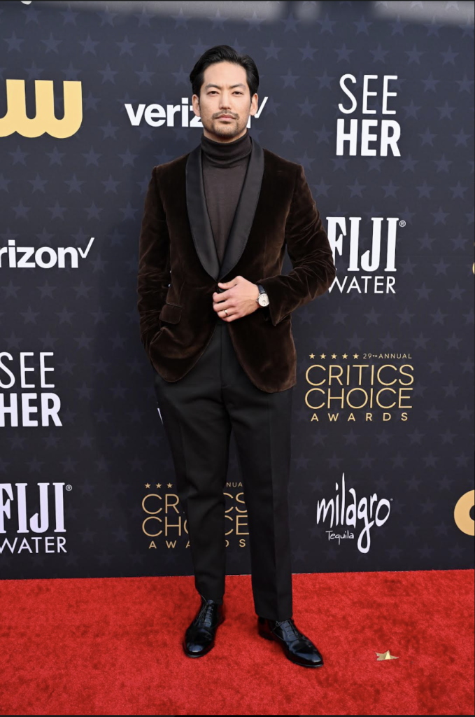 Joseph Lee, protagonista de la galardonada Mejor Serie Limitada «Beef», lució una chaqueta de esmoquin de terciopelo marrón a medida de ZEGNA con solapa chal de seda negra, cuello alto de cachemira y seda tonal y pantalones de mohair de lana negra.