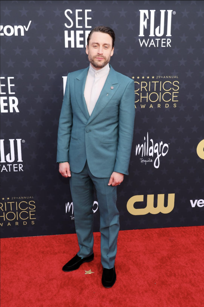 Kieran Culkin, Mejor Actor en una Serie Dramática, lució un esmoquin ZEGNA hecho a medida en mezcla de lana y seda verde azulado con solapa de pico, camisa gris perla sin cuello con tapeta cubierta y mocasines negros de terciopelo.