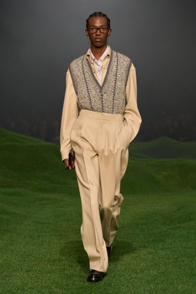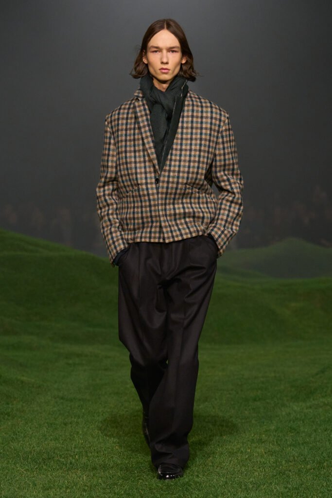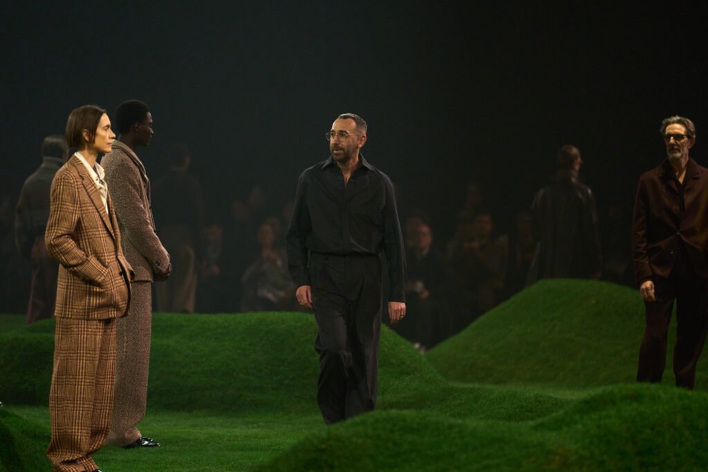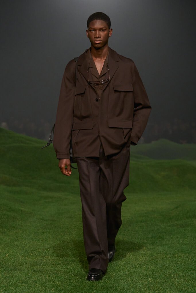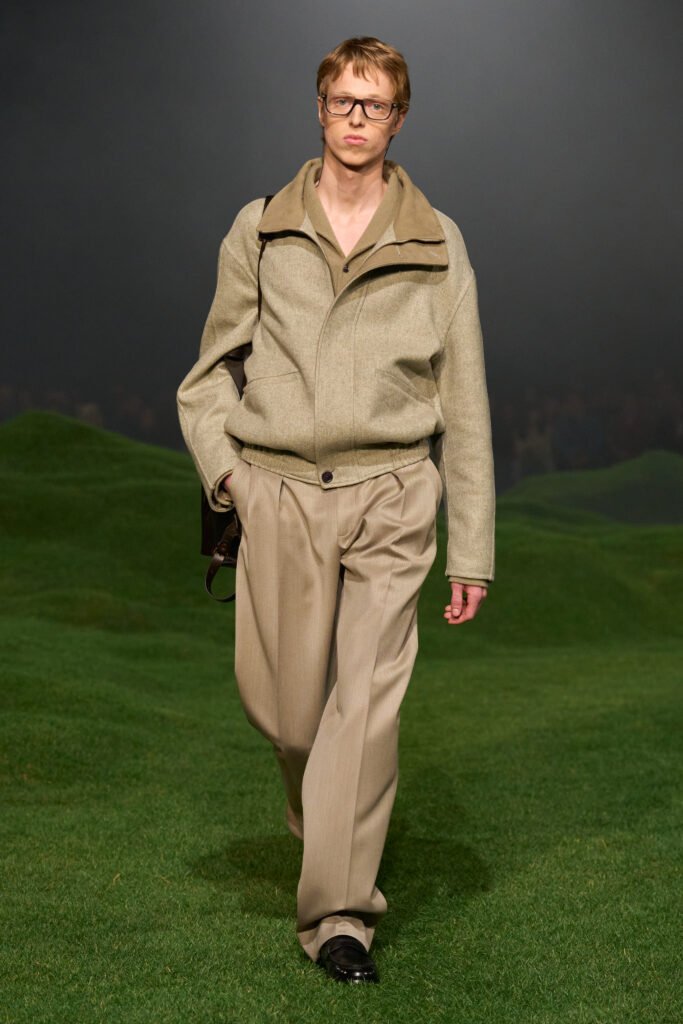 El nuevo desfile y la nueva colección son un homenaje a esta mentalidad global. Las suaves colinas cubiertas de la hierba más verde sobre las que desfilaron los modelos recuerdan el verdor y la escala de los paisajes australianos, sus líneas sinuosas, un símbolo de continuidad entre el hombre y la naturaleza, así como una conexión entre mundos y oficios geográficamente distantes, y sin embargo conectados.