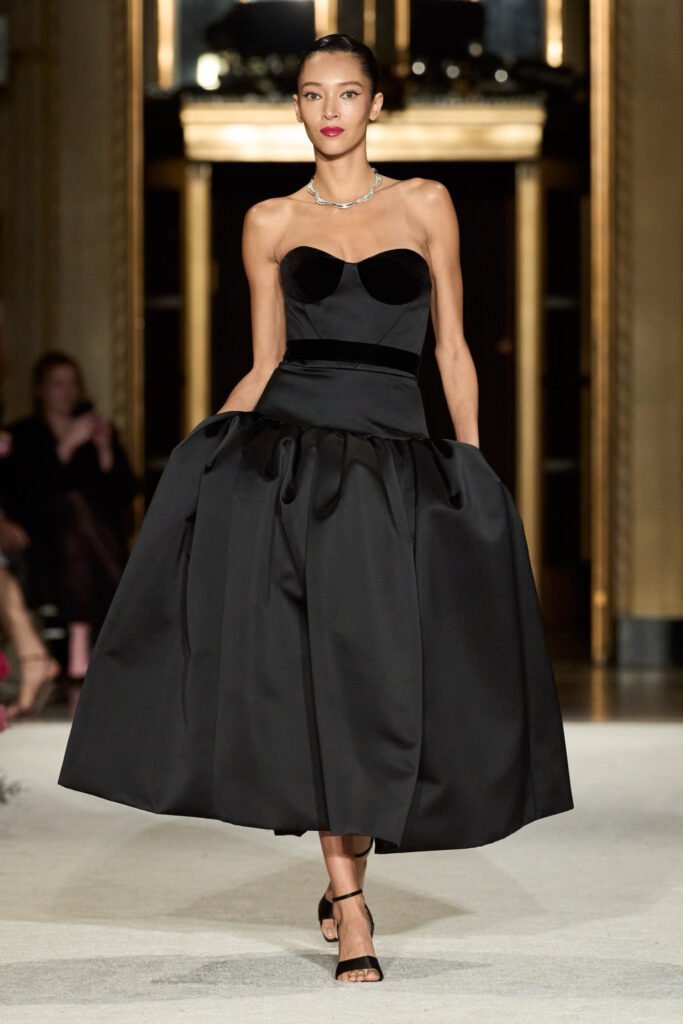 El corte inspirado en los años 50 y el «new look» combinando tafetan y terciopelo negro son la epitome de la elegancia llamativa y moderna que toda joven quiere lucir.