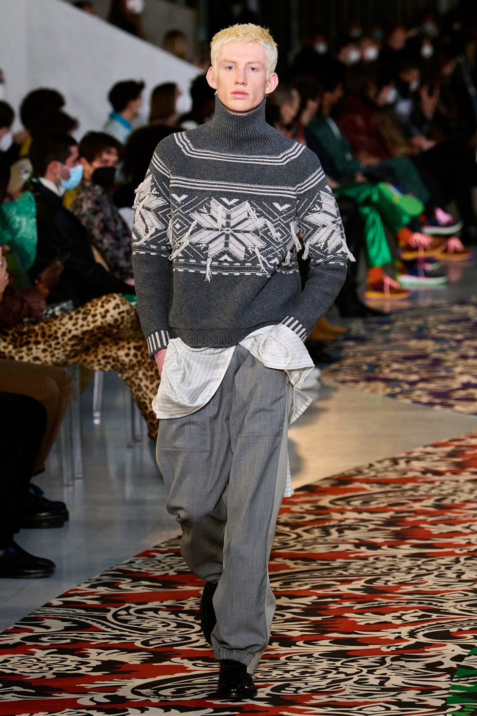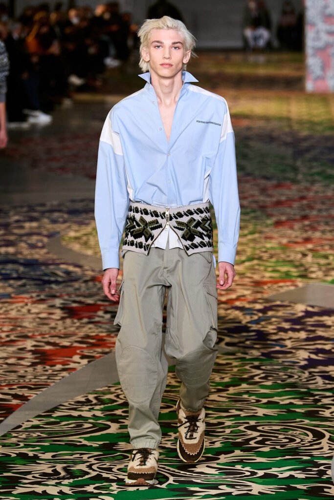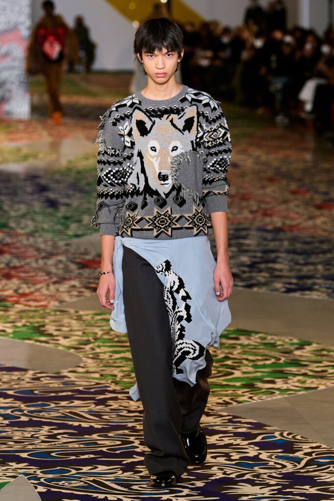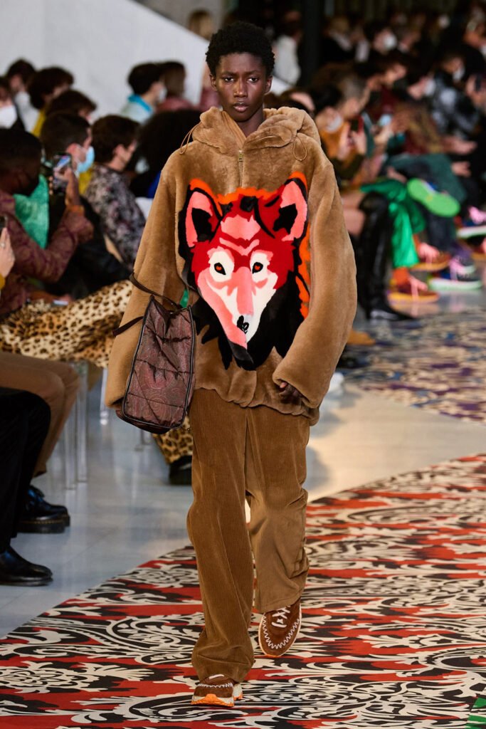 En la pasarela encontramos tenis con parches de piel de oveja pespunteada, pantalones anchos de pierna recta de pana y jerseys de lana.
