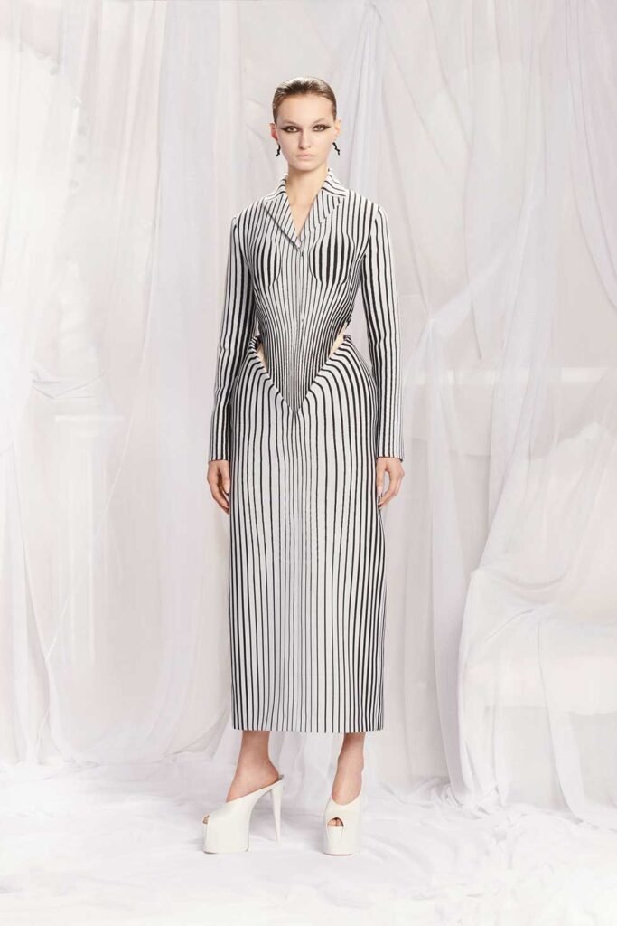 En las nuevas creaciones podemos ver las rayas marineras que son puramente Gaultier, pero algunos giros en los vestido, como la línea de los hombros doblada, el panel de punto, que son más ideas de Martens.