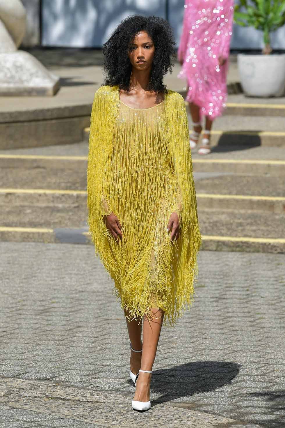 Rodarte utilizó para primavera 2022 lentejuelas y flecos disco para una fiesta imprescindible, en varias de sus prendas.